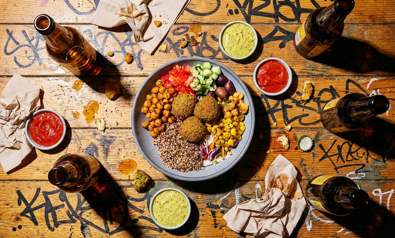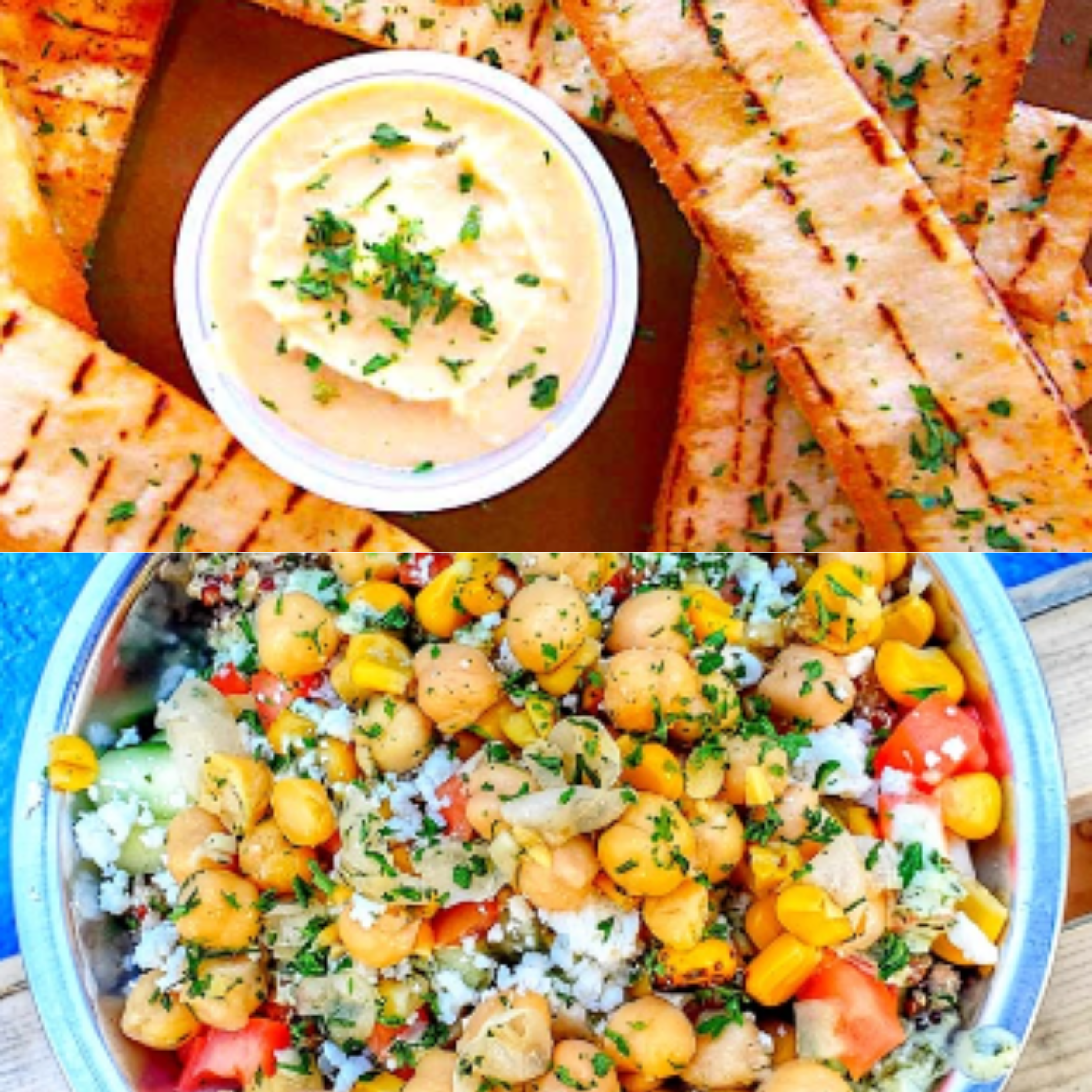 Welcome delicious filafel (or meat), quinoa, tomato, cucumber, roasted corn, feta (sans), harissa, kalamata olives (sans), crispy AND marinated garbonzo, cabbage slaw (sans), and lemon herbed dressing. I’m odd and keep the ingredients separate - don’t mix em’ up. I like to chose what’s next.
